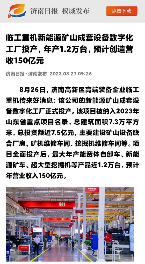 8月26日,臨工重機數(shù)字化工廠投產(chǎn)活動在濟南高新區(qū)智能裝備城舉行。臨工重機新能源礦山成套設(shè)備數(shù)字化工廠項目,入選2023年山東省重點項目,總建筑面積7.3萬平方米,總投資額近7.5億元,最大年產(chǎn)能寬體自卸車、新能源礦車、超大型挖掘機等產(chǎn)品1.2萬臺,是山東省首個年產(chǎn)能超萬臺礦山設(shè)備數(shù)字化工廠。