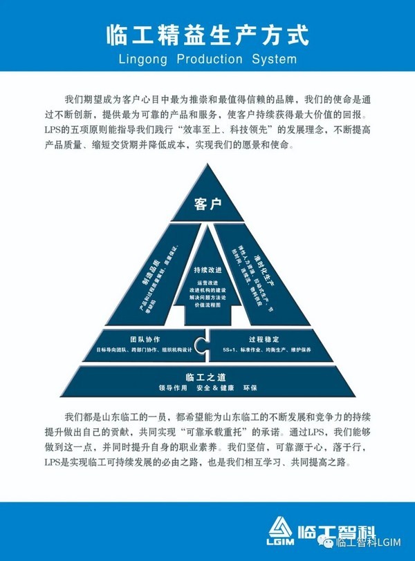 臨工集團自2007年推進精益生產至今,結合豐田、沃爾沃等精益管理方式,形成了獨具特色的臨工精益管理模式,培養儲備了實踐經驗豐富的高技能人才團隊、講師團隊和高層次國際專家顧問團隊。作為臨工集團的全資子公司,臨工智科凝聚了臨工集團的精益智慧資源,汲取了國際化管理經驗,形成了經典的管理案例集,向著為更多企業培養精益人才,幫助更多企業構建精益管理體系的目標不斷邁進。